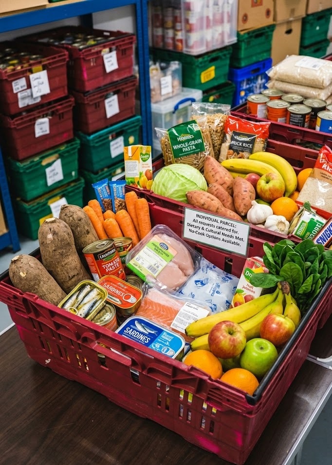 Our food banks always adapt to individual needs, as we are aware of religious requirements, dietary needs, and situations where there may be limited or no cooking facilities due to homelessness. We are always available to discuss any specific requirements you may have.
